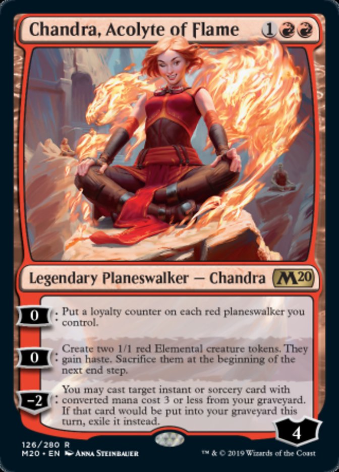 - Turn 3: Play Chandra, Acolyte of Flame [] and activate her first loyalty ability.